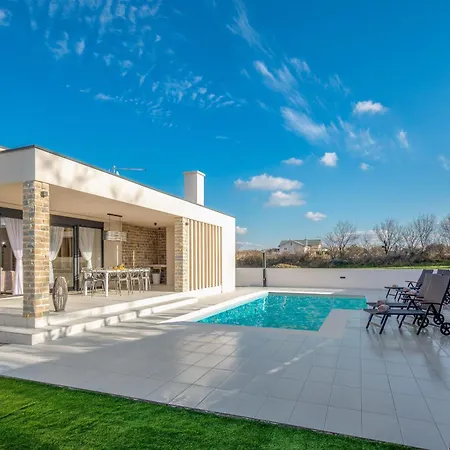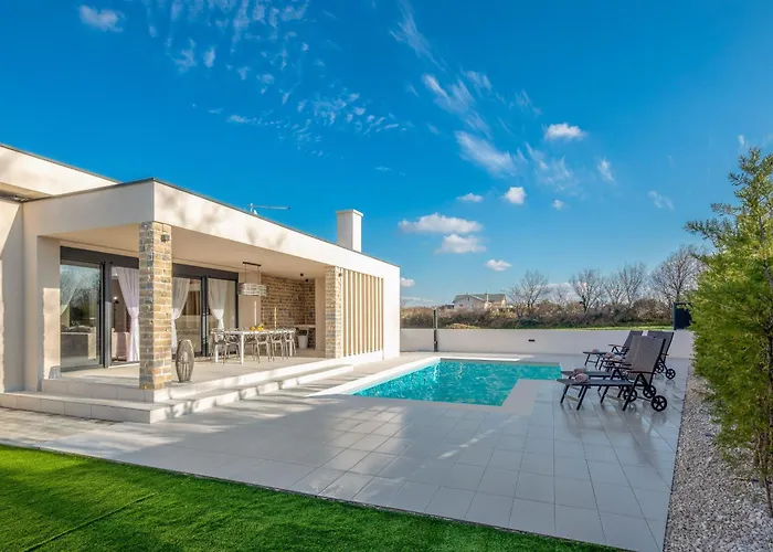 A medencére néző terasszal rendelkező 3 hálószobás Villa Rose Nin Zadarvillas 32 perces autóútra fekszik a Zadar repülőtértől.